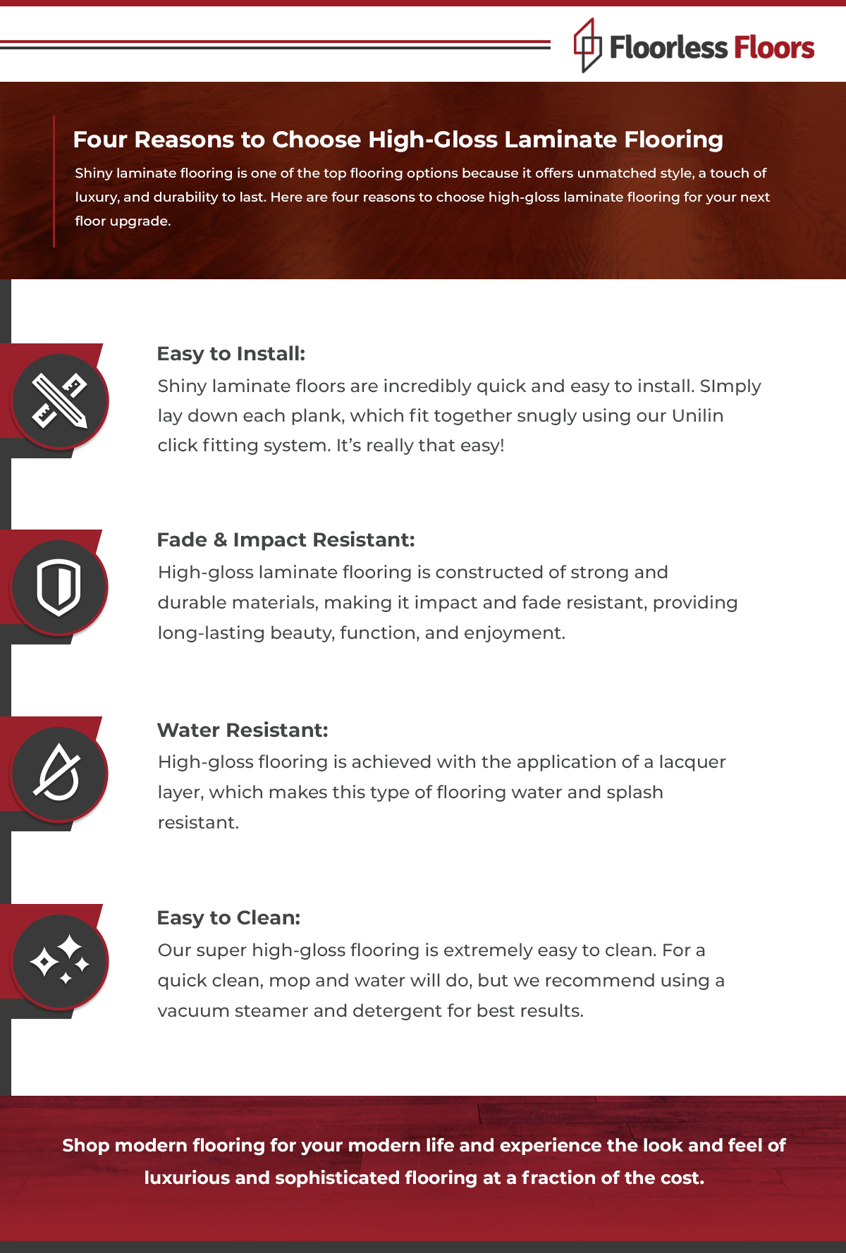 While these are all excellent reasons to choose shiny laminate flooring, there are so many more left to explore! Today, we are going to pick up where we left off last time and look at four more reasons why you ought to install gloss laminate flooring in your home. Ready to see all the options you will have to choose from? Visit Floorless Floors now to start shopping our range of affordable, luxury floors.